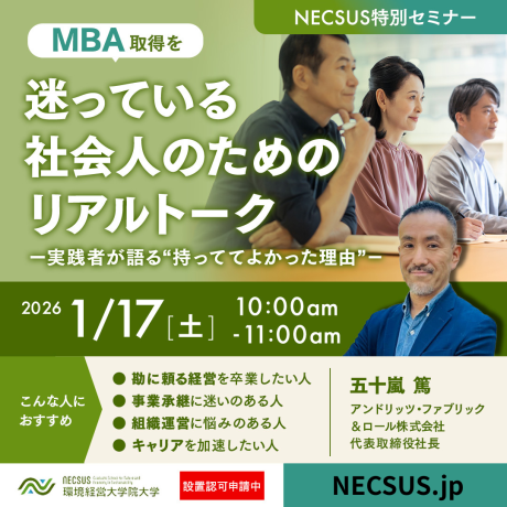急速に変化するビジネス環境では、実務だけでは捉えきれない課題に向き合うため、実践と理論を往復しながら学ぶ姿勢が求められます。本セミナーでは、多様な企業・組織でリーダーとして実務経験を重ね、MBA・実務教育学修士・博士課程で学び続ける登壇者が、実務を続けながら体系的に学ぶ価値を対話形式でお伝えします。
